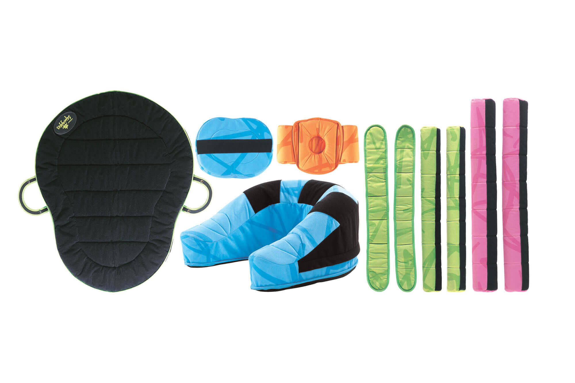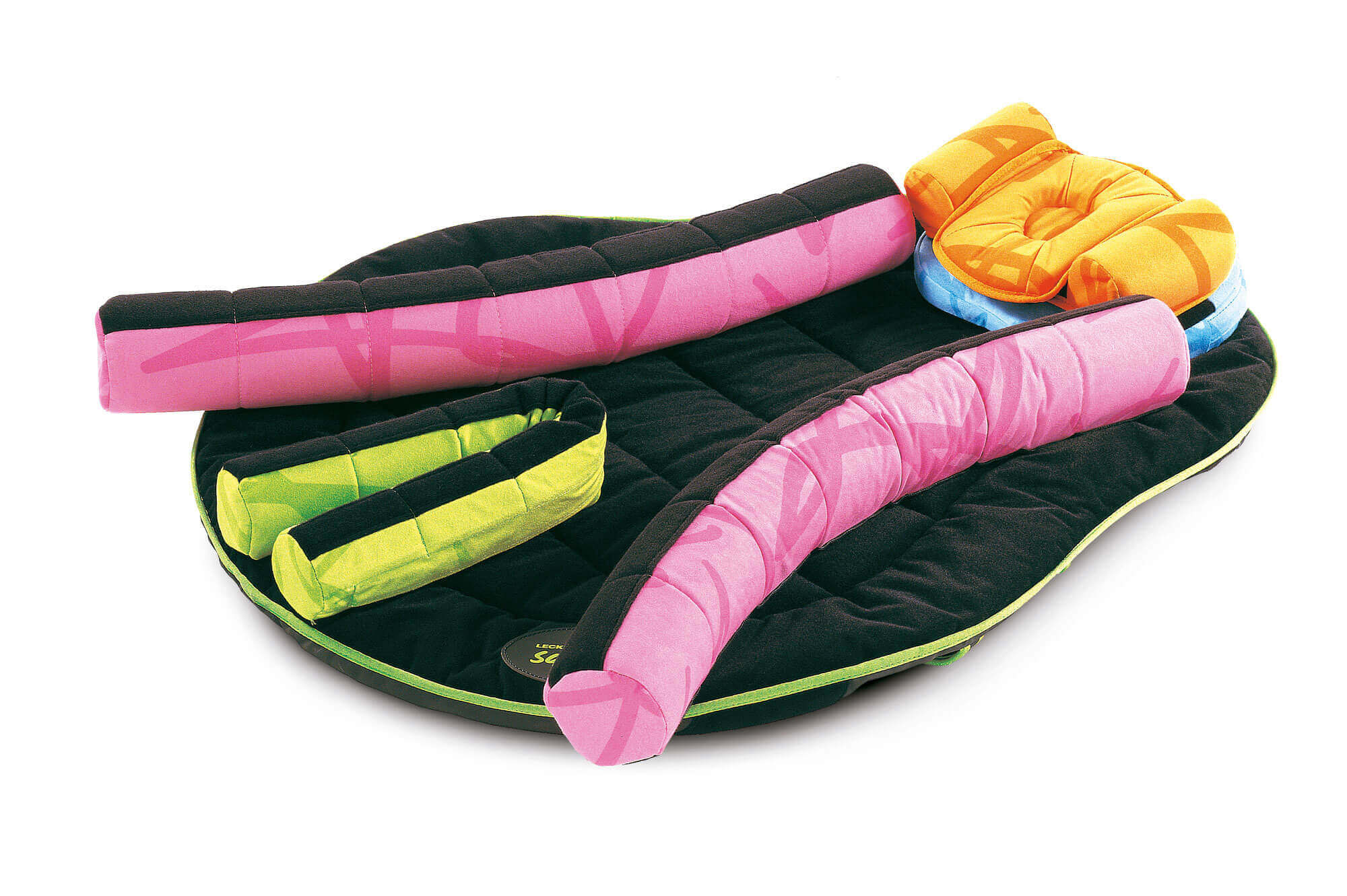 Le tapis d'activité sensori-moteur comprend un tapis de jeu rembourré, un grand coussin mousse en U, un cale-tronc, un cale-tête, 2 ceintures de positionnement, 4 éléments cylindriques : 2 petits et 2 grands, un manuel de thérapie et un sac de transport. Tous les éléments sont modulables et peuvent être ajustés individuellement à l'aide de la fermeture auto-adhésive velcros haute résistance.